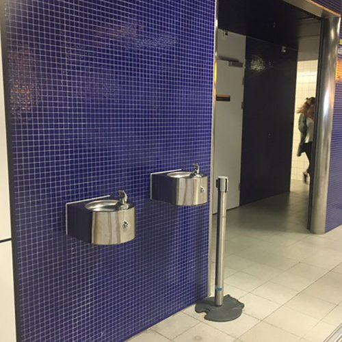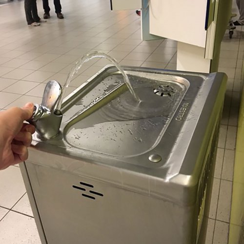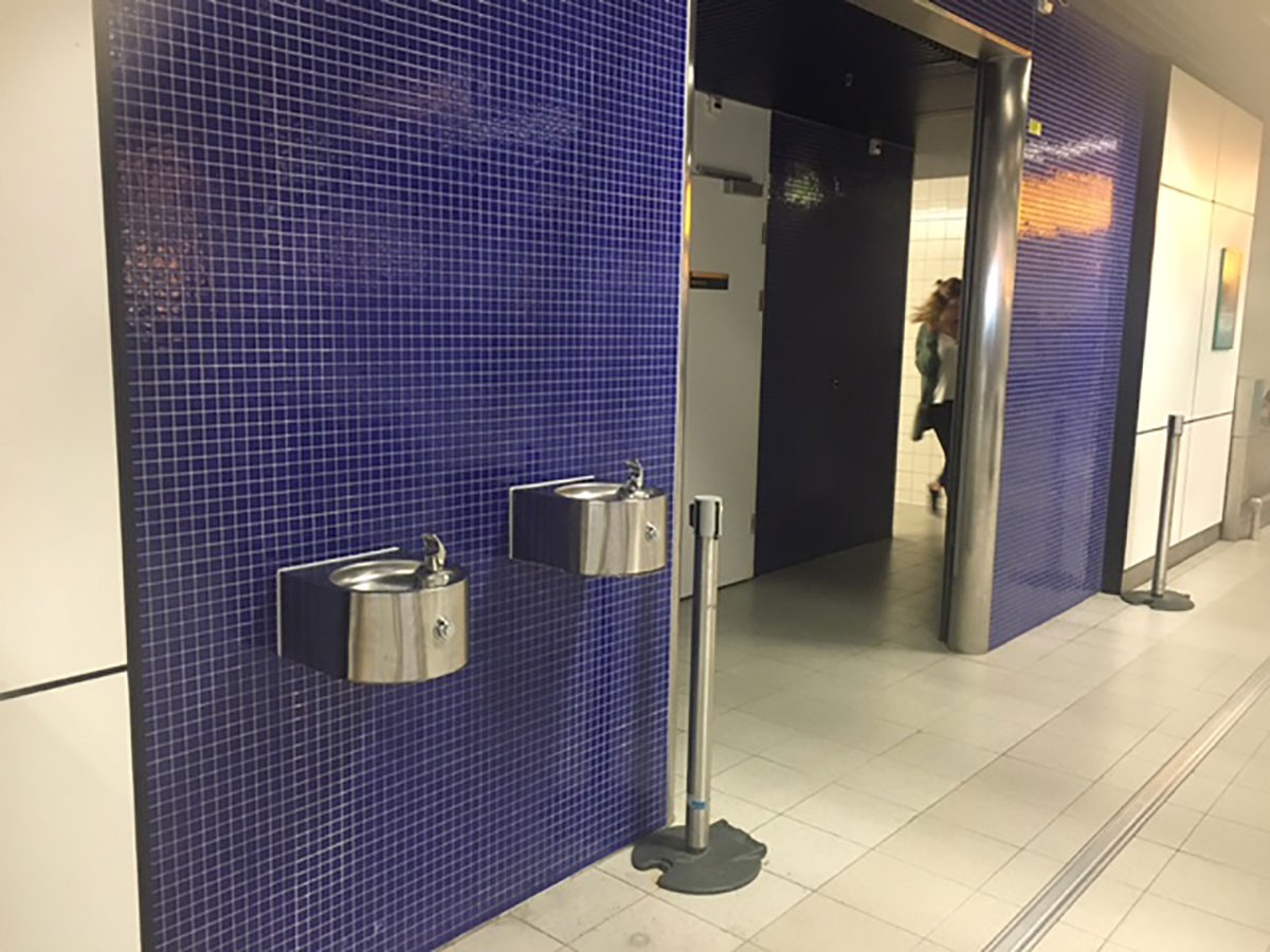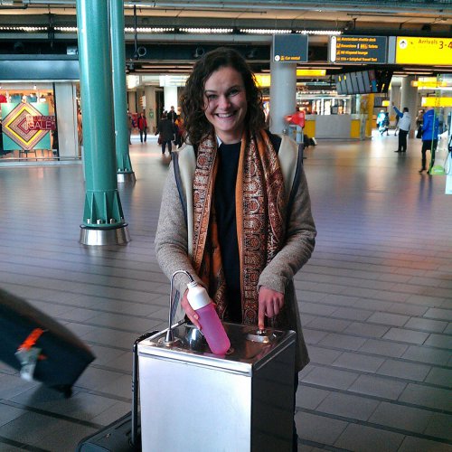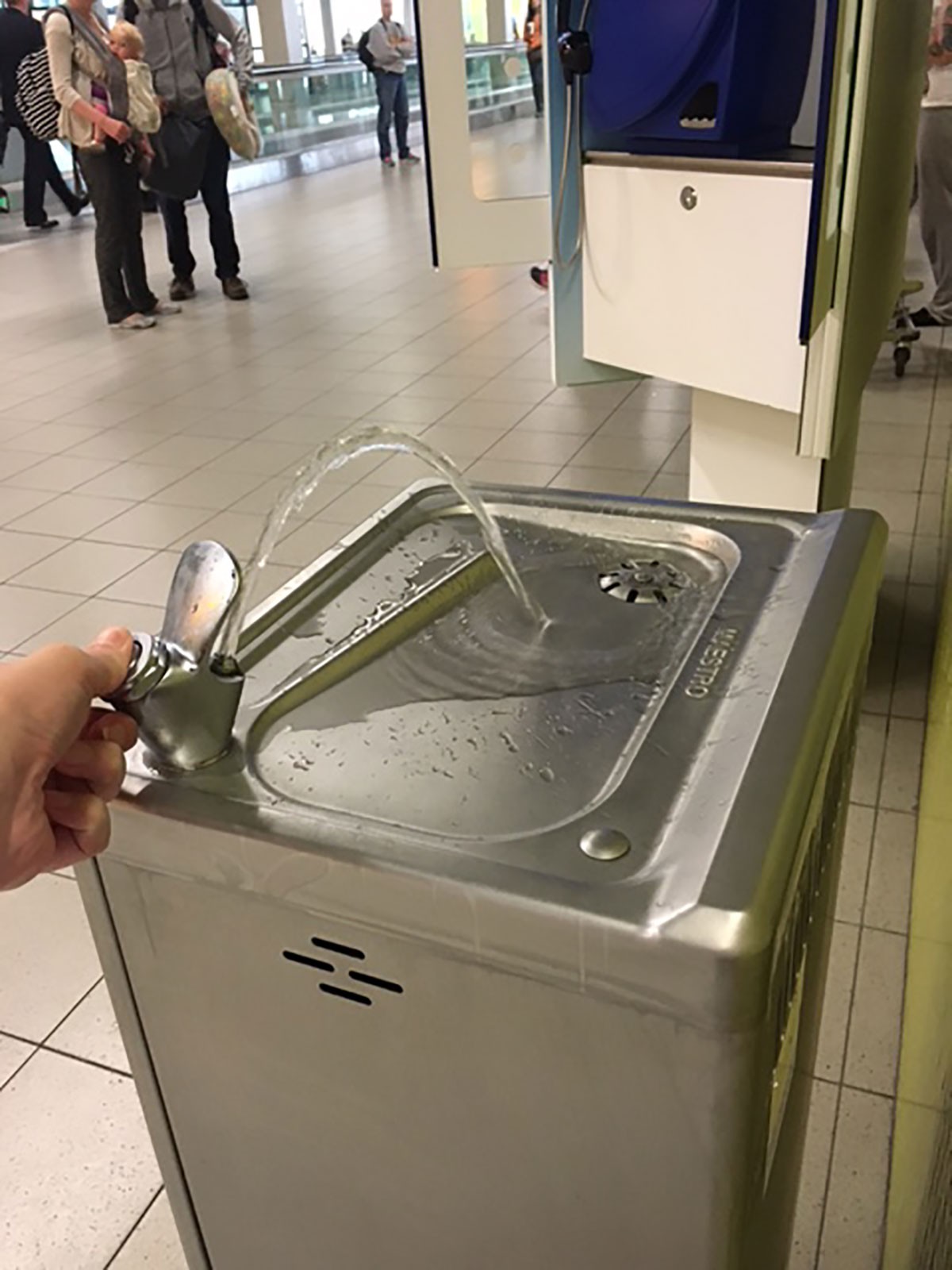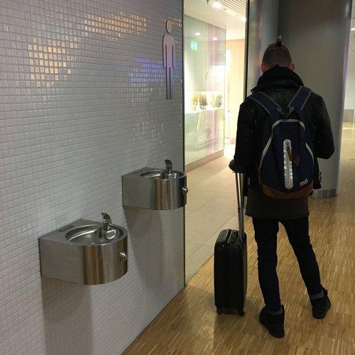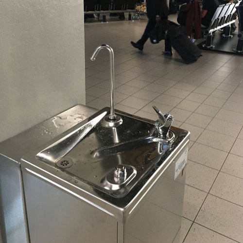 Op een vliegveld moet een waterkoeler tegen een stootje kunnen. Op Schiphol staan dan ook robuuste drinkwaterpunten, met een flinke tapcapaciteit. Ze hebben zowel een bidonvuller als een spuitmond om het water direct te kunnen drinken.