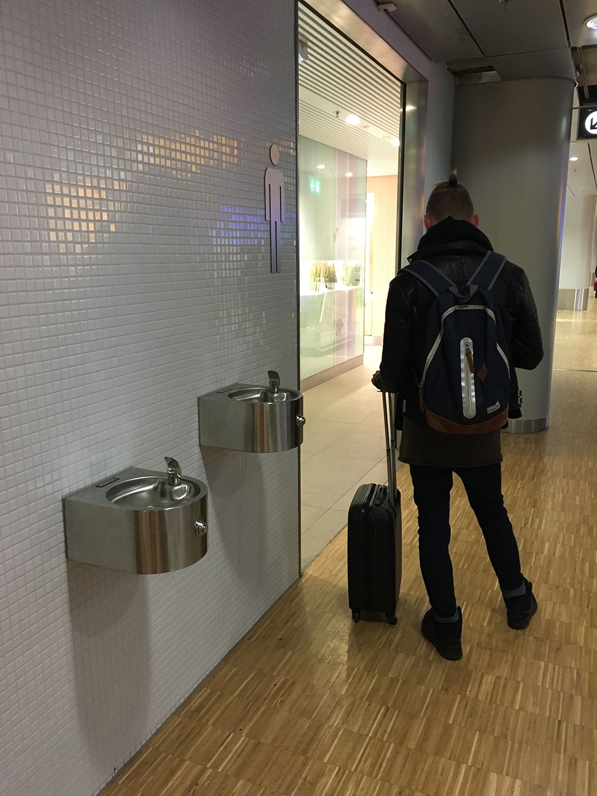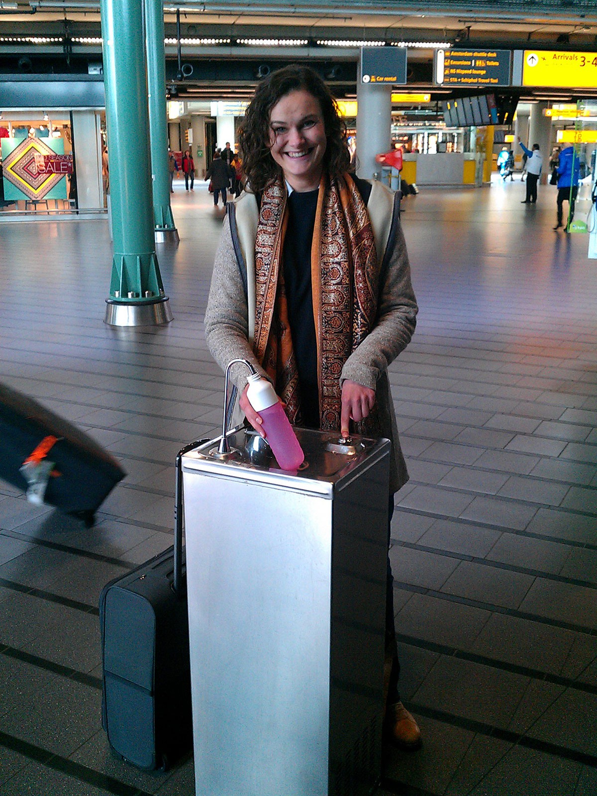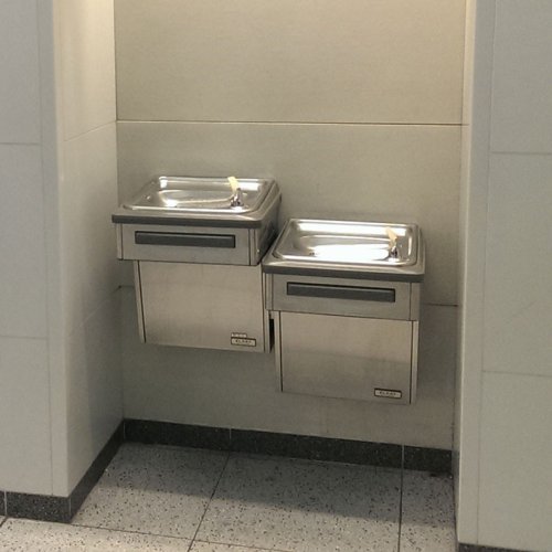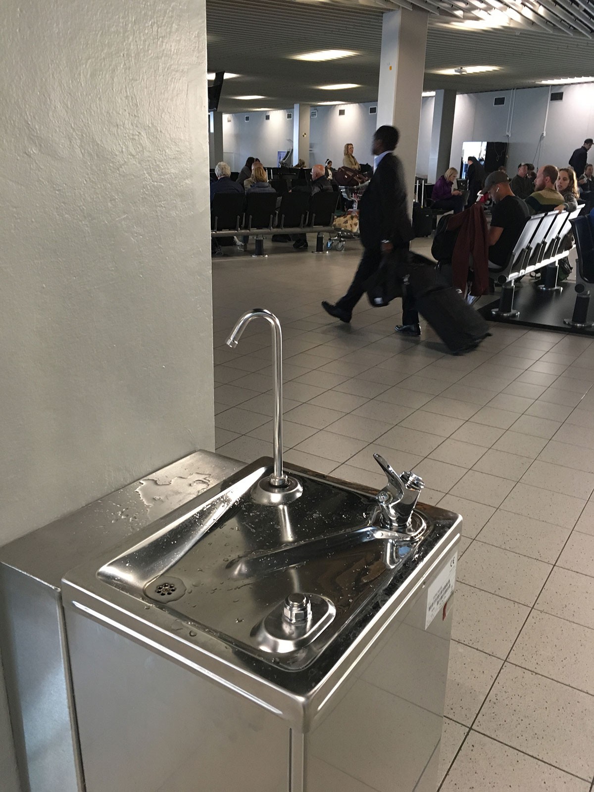 Op een vliegveld moet een waterkoeler tegen een stootje kunnen. Op Schiphol staan dan ook robuuste drinkwaterpunten, met een flinke tapcapaciteit. Ze hebben zowel een bidonvuller als een spuitmond om het water direct te kunnen drinken.